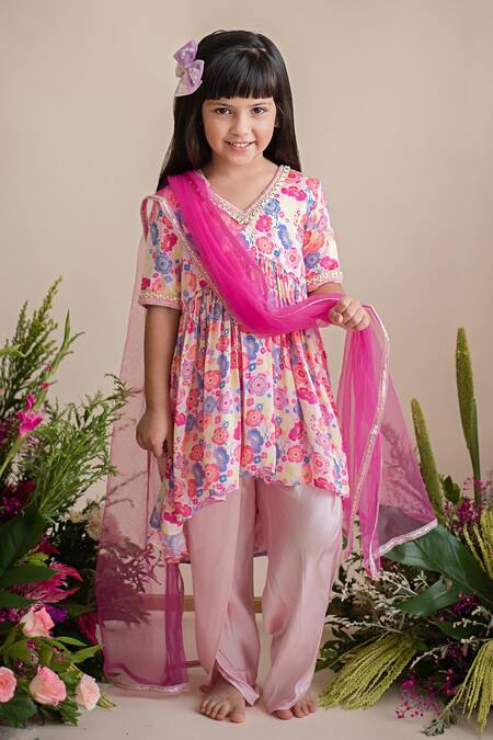 Buy_PA:Paa_Pink Cotton Satin Print And Embroidery Floral Print Beads Kurta & Dhoti Pant Set_at_Aza_Fashions