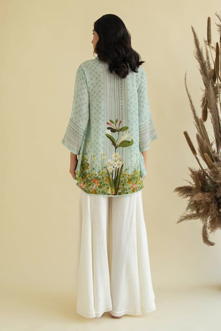 Mint blue short kurta with geometric, floral printed motifs & sequin work. Paired with flared pant.