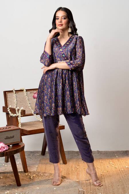 Purple chiffon A-line tunic with floral print, collar V neck, pearl & glass bead highlights on yoke. Paired with sequin work straight pants.
