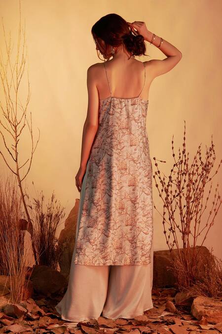 Pastel blue kurta with all-over floral print, scoop neckline, sleeveless & straight silhouette. Comes with sharara & organza dupatta.