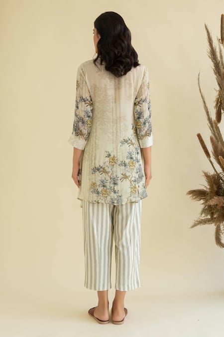 Cream asymmetric kurta with floral printed & embroidered motifs. Paired with striped pant.