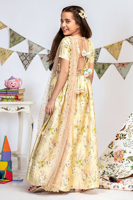 Buy_PS Kids By Payal Singhal_Yellow Silk, Net Mirrors, Embroidery Floral Print Lehenga Set_at_Aza_Fashions