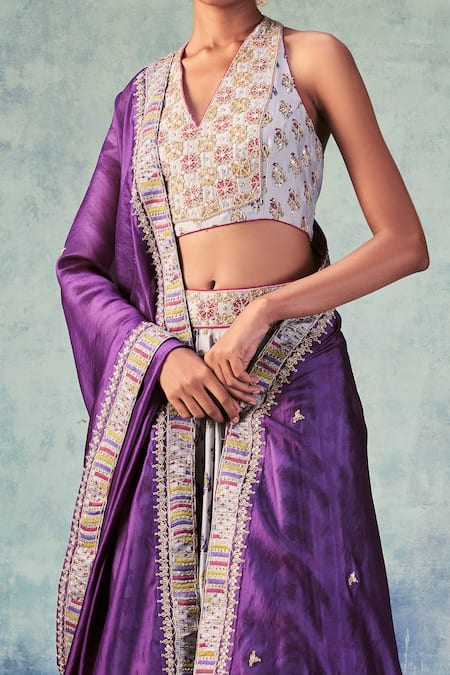 Grey printed chanderi silk lehenga with marodi work waistband. Paired with printed halter neck blouse & organza silk dupatta.