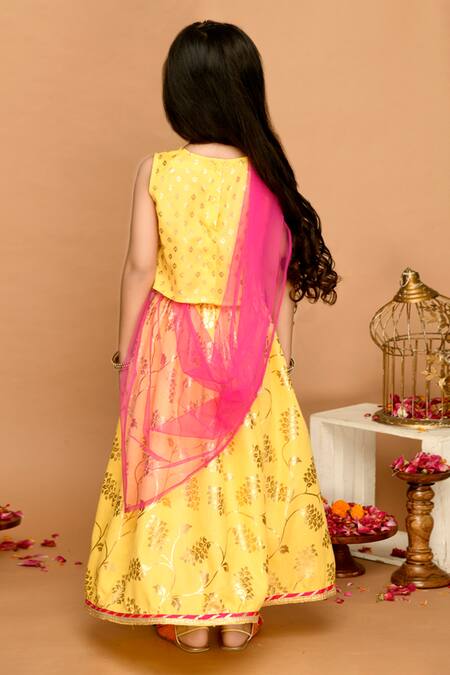Yellow lehenga featuring floral print with side tassel tie-up and lace border. Paired with a matching sleeveless blouse and sheer pink dupatta.