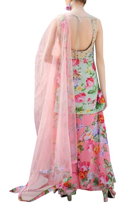 Green Floral Print Low Back Kurta Palazzo Set