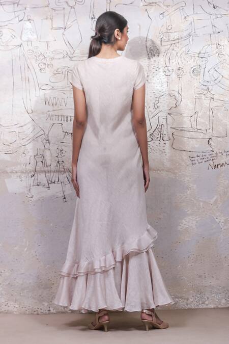 Buy_Ekru_White Organza, Noil, Silk Muslin Round Floral Print Ruffle Gown_Online_at_Aza_Fashions
