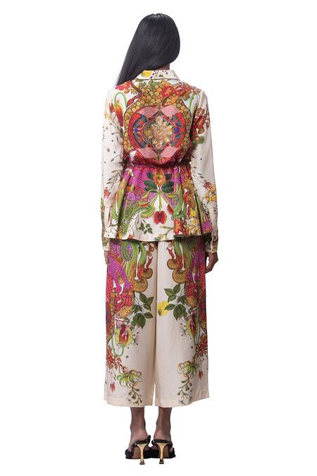 Cream shirt with floral printed motifs and elasticated drawstring at the waist. Comes with co-ordinating culottes.
