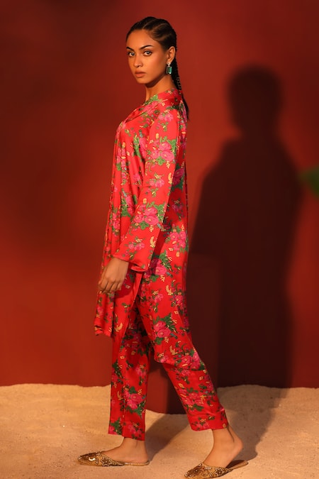 Buy_Shetab Kazmi_Red Modal, Satin V-neck Floral Print Tunic And Pant Set _at_Aza_Fashions