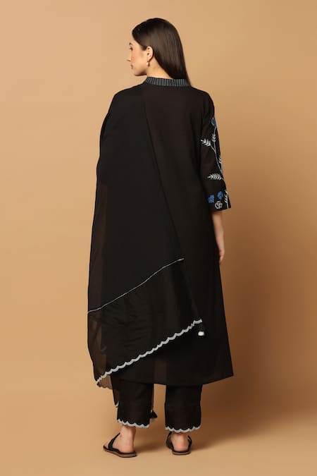 Black A-line kurta featuring contrast ink blue and grey resham floral embroidery. Paired with scalloped hem pant and tassel edged dupatta.