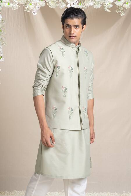 Green Cotton, Silk Embroidery Floral Bundi Kurta Set
