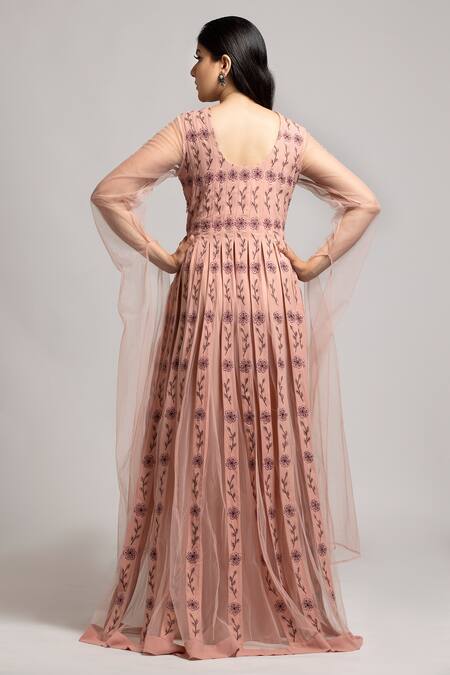 Peach kalidar gown with floral embroidered motifs and net sleeves.