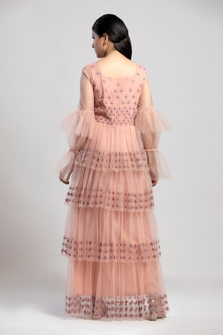 Peach Banana , Poly And Nylon Net Floral Work Pleated Layered Gown
