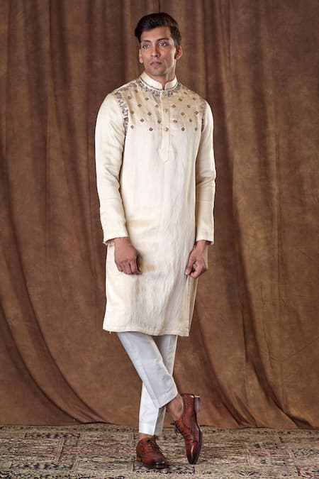 Beige kurta featuring floral and geometric sequins embroidery with a mandarin collar. Paired with matching pants, this silk linen set is designed for comfort and elegance.