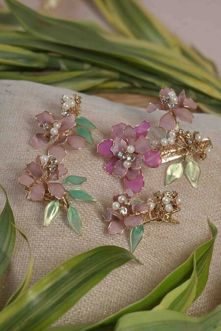 Multi color floral blossom patterned hair pins embellished with stones and pearls. Set includes four unique designs featuring delicate leaves and floral motifs.