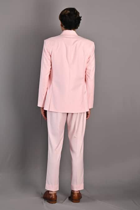 Light pink suit with notched lapel collar. Comes with white shirt & light pink straight pant.