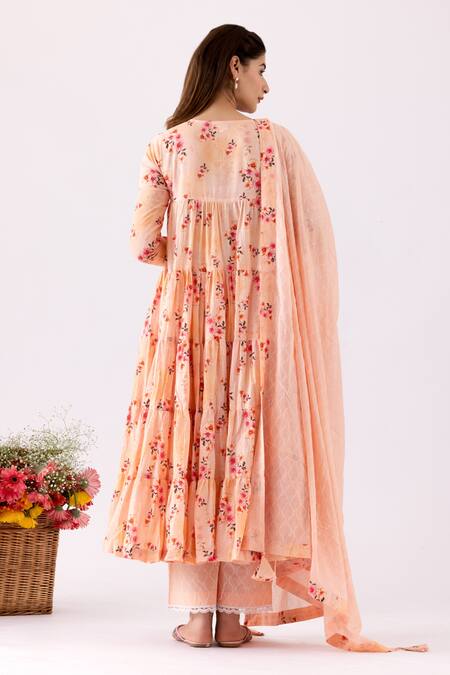 Buy_Abbaran_Peach Cotton Embroidery, Lace Round Neck Flower Block Print Anarkali Set_Online_at_Aza_Fashions