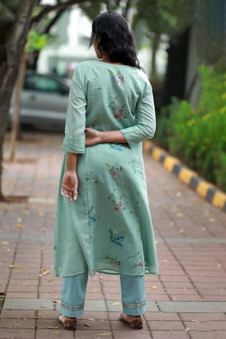 Mint three quarter sleeve kurta made in cotton base, accentuated with scattered flower vine print. Paired with a pant and dupatta.