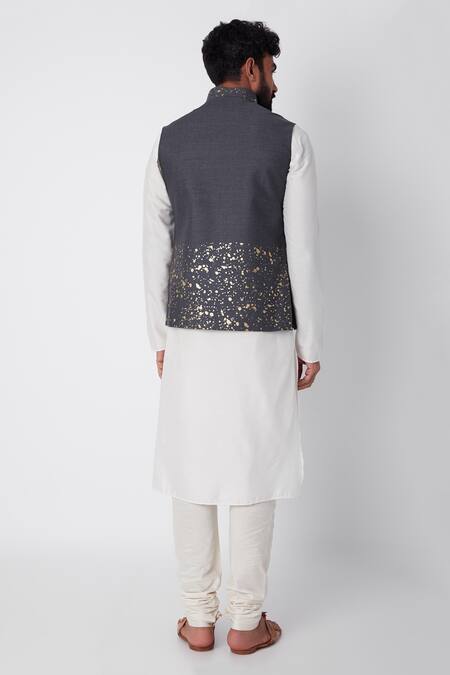 Cobalt blue asymmetrical bundi with foil print and welt pocket.