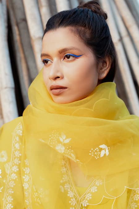 Turmeric yellow kurta featuring gold foil print, floral resham embroidered front panel & bell sleeves. Paired with printed pant and floral embroidered dupatta with scalloped cut work hem.