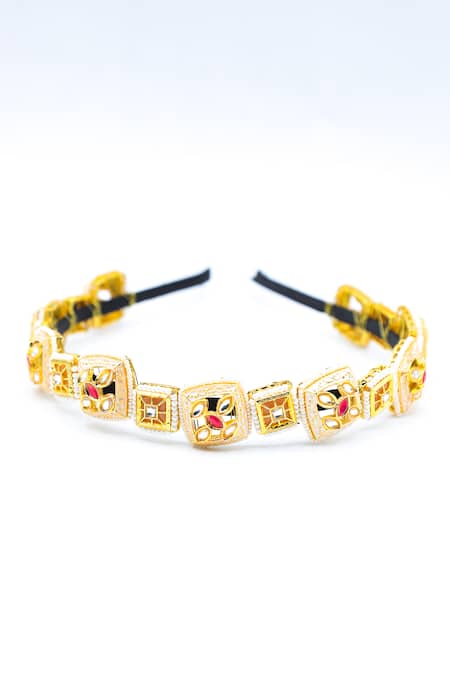 Gold toned geometric shaped hairband featuring stone, bead, and crystal embellishments