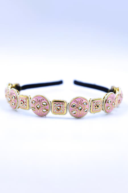 Gold and pink abstract carved cutwork brooch hairband featuring bead and crystal embellishment