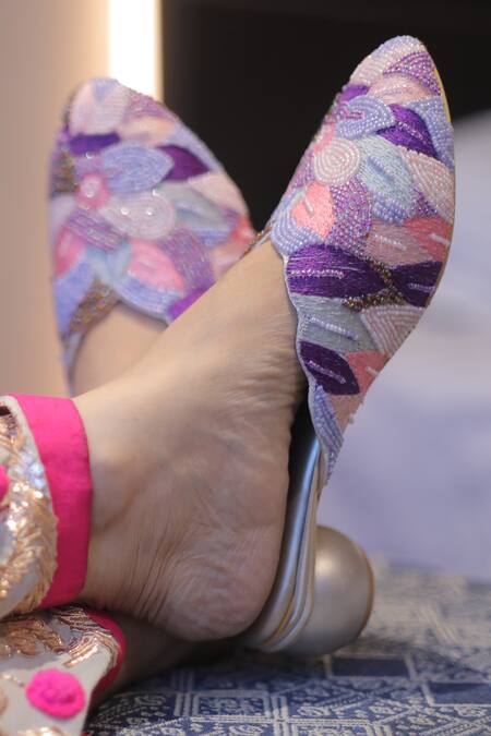 Multi color matka heels featuring a blooming petals pattern embellished with purple tonal beads