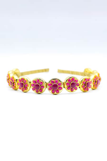 Gold hair band featuring blossom-shaped crystal embellishments in pinkish purple tones