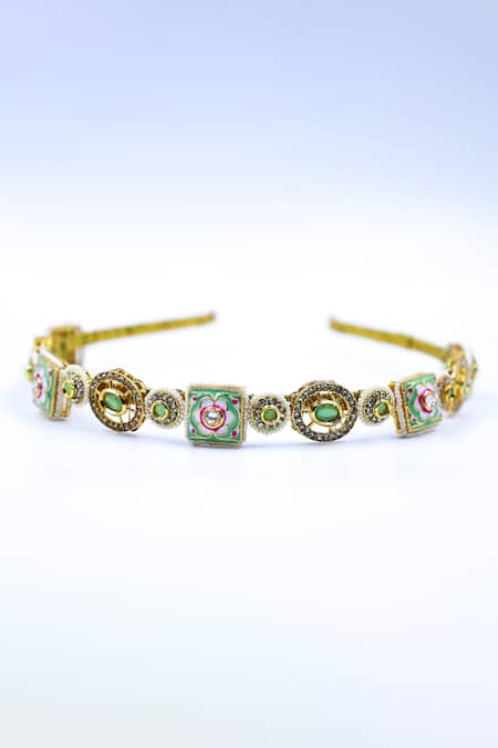 Gold hairband featuring floral and geometric brooch designs adorned with crystals and beads