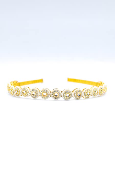 Gold hairband featuring a circular broach embellished with beads and crystals