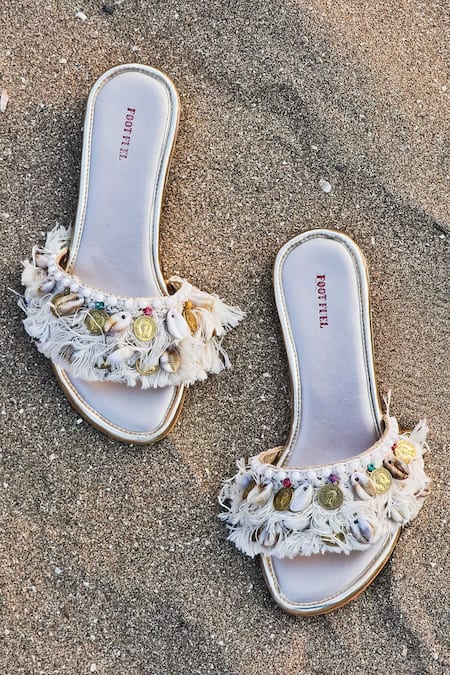 Gold and white embellished flats featuring shell, coin, and bead details on the straps