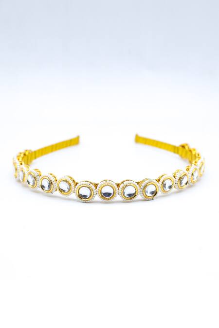 Gold circular hairband featuring stone, bead, and crystal embellishments
