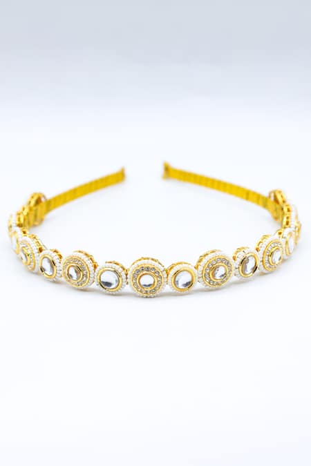 Gold circular shaped hairband featuring stone, bead, and crystal embellishments