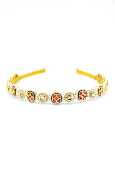 Gold tone hairband featuring multicolour crystal and bead studded brooch