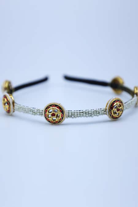 Gold Crystals, Beads Studded Round Brooch Hairband