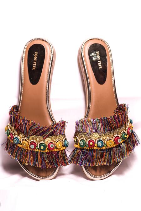 Multicolored flats featuring fringe and coin embellishments on the strap