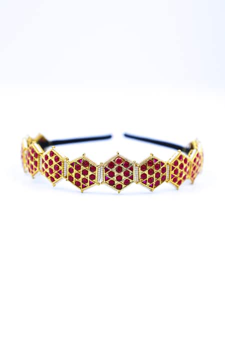 Gold hexagon shaped hairband featuring bead and crystal studded embellishments