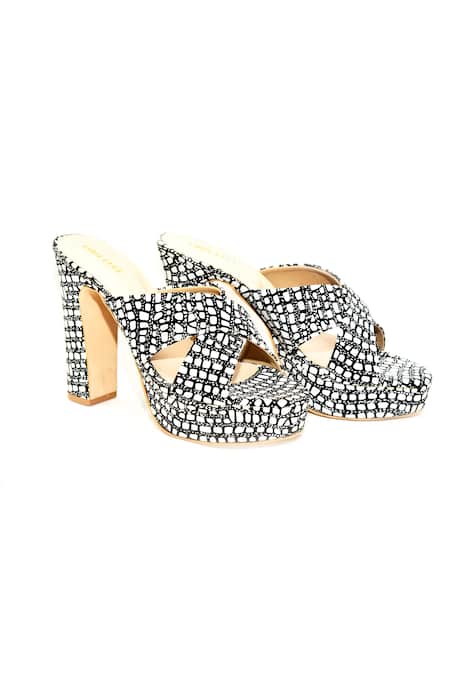 Black heels featuring a geometric print and crisscross detailing on the strap