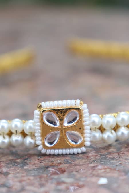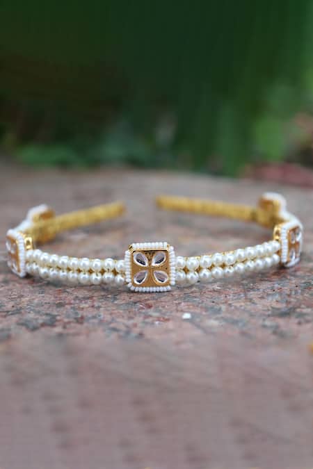 Gold hairband featuring pearl lined design with stone studded brooch embellishments