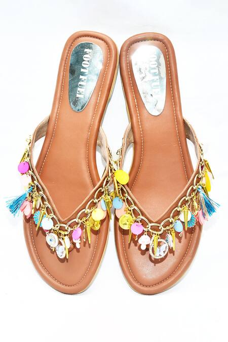 Brown embellished flats featuring a round toe and a decorative strap with metal chain, coin, and charm embellishments