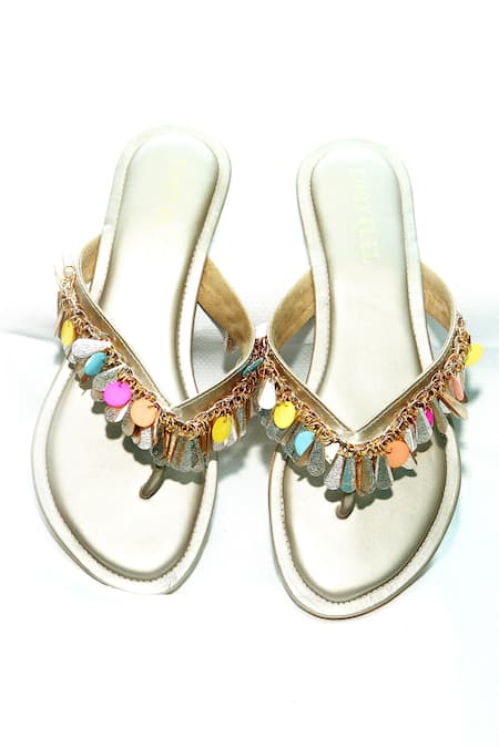 Embossed sequin tassels on the T-strap, Round toe detailing, Colorful embellishments on the strap