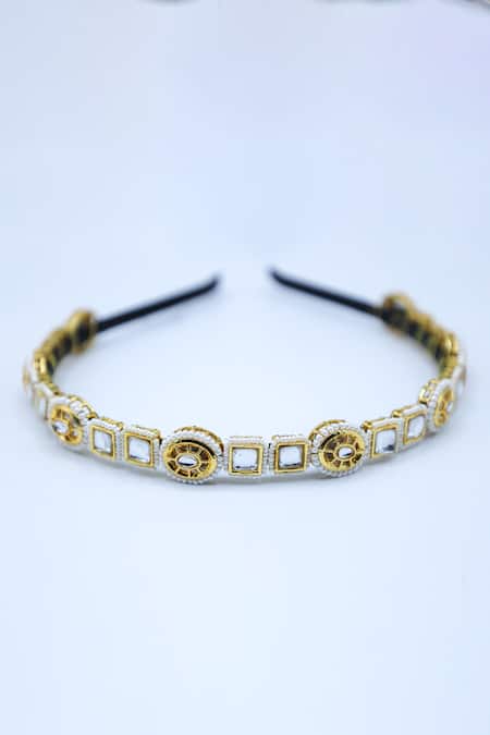 Gold tone hairband featuring crystal studded oval and square patterned brooches