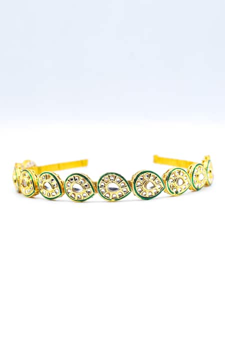 Gold toned tear drop shaped hairband featuring stone, bead, and crystal embellishments