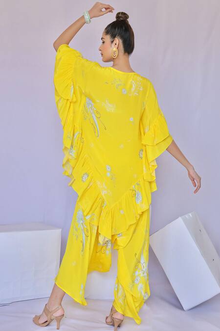 Yellow Crepe Mirrors, Embroidery Blossom Print Ruffled Kurta Flared Pant Set