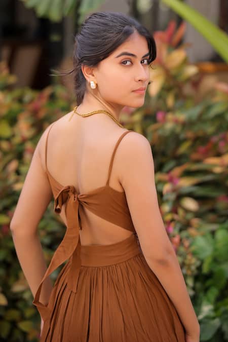 Brown designer dress made from rayon featuring a tiered design and spaghetti straps