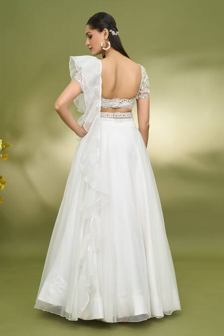 White lehenga featuring hand embroidered mirror work and attached cancan. Paired with a padded blouse and a net dupatta with ruffled detailing.