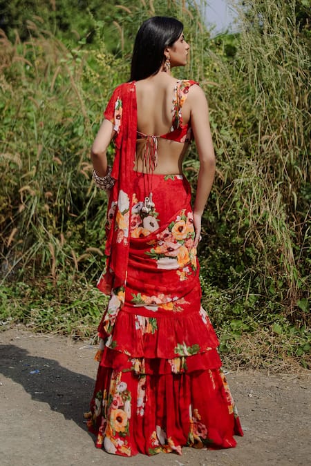 Red pre-draped saree featuring ruffled layers and all-over floral prints. Paired with a coordinating blouse with a cowrie shell tie-up.