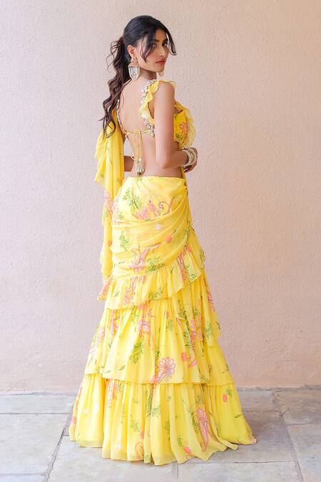 Yellow ruffle pre-draped saree featuring floral print and hand embroidery. Paired with a padded blouse adorned with cowrie and thread work.