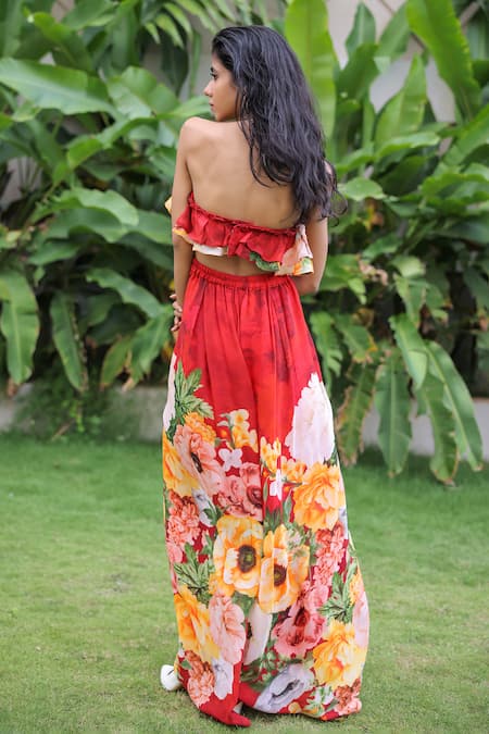 Red georgette top featuring a ruffled design and floral print. Paired with matching floral print wide-leg pants.