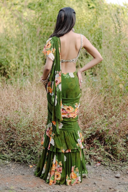 Green pre-draped ruffle saree featuring an all-over gardenia bloom print. Paired with a sleeveless blouse adorned with cutwork edges and mirror-thread work.