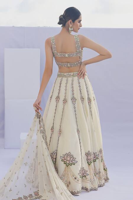 Beige and cream lehenga set featuring cutdana embellished lotus patterns. Includes a padded embellished blouse and dupatta.